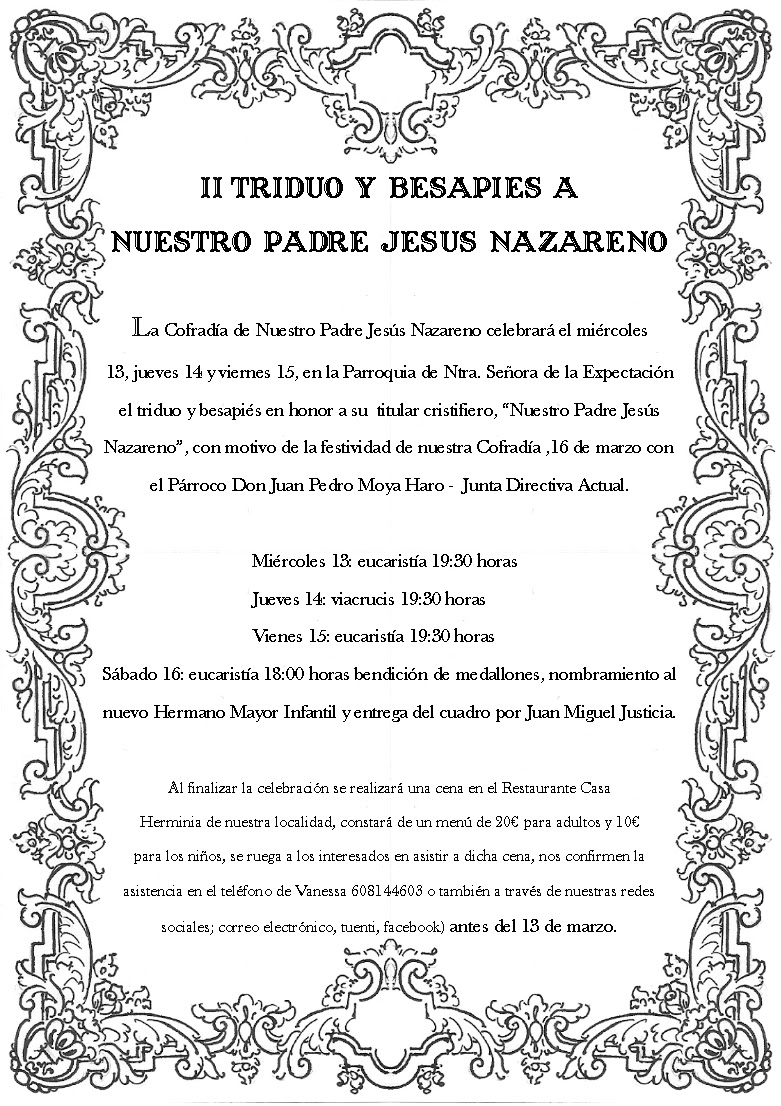La cofradía de Ntro. Padre Jesús Nazareno celebrará el miércoles 13, jueves 14 y viernes 15, en la Parroquia de Ntra. Señora de la Expectación el triduo y besapiés en honor a su titular cristifiero, "Nuestro Padre Jesús Nazareno", con motivo de la festividad de nuestra Cofradía, 16 de marzo con el Párroco Don Juan Pedro Moya Haro - Junta Directiva Actual.
